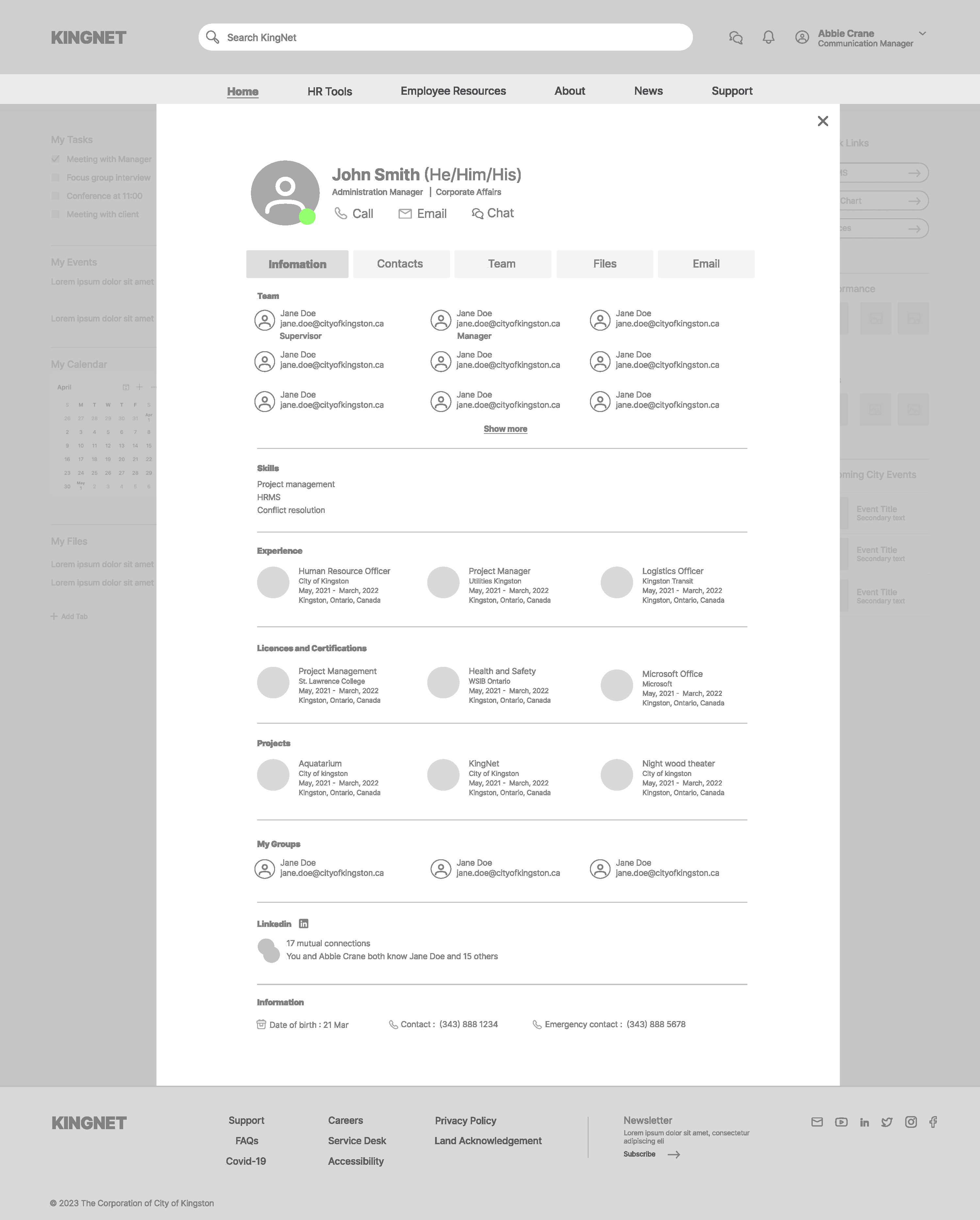 The question now is, how can KingNet be a go-to intranet for City of Kingston employees? To address this, our culminating project at our UX Design course in St. Lawrence College was aimed at improving the overall user experience of KingNet, making it more useful and valuable to employees. Specifically for our team, we redesigned the home, news and my profile pages. It transforms the current intranet from being merely a jump off point to other third party sites to a tool to improve internal communications and work productivity of employees. This is achieved by a more structured information architecture, a personalized dashboard, and an effective layout of different functionalities in one space. I collaborated with four of my classmates, Shreya Sur, Hailey Hyo, Jonathan Lopez and Pronoy Kapoor to make this project a success. My roles included project manager, UX researcher and UI designer.